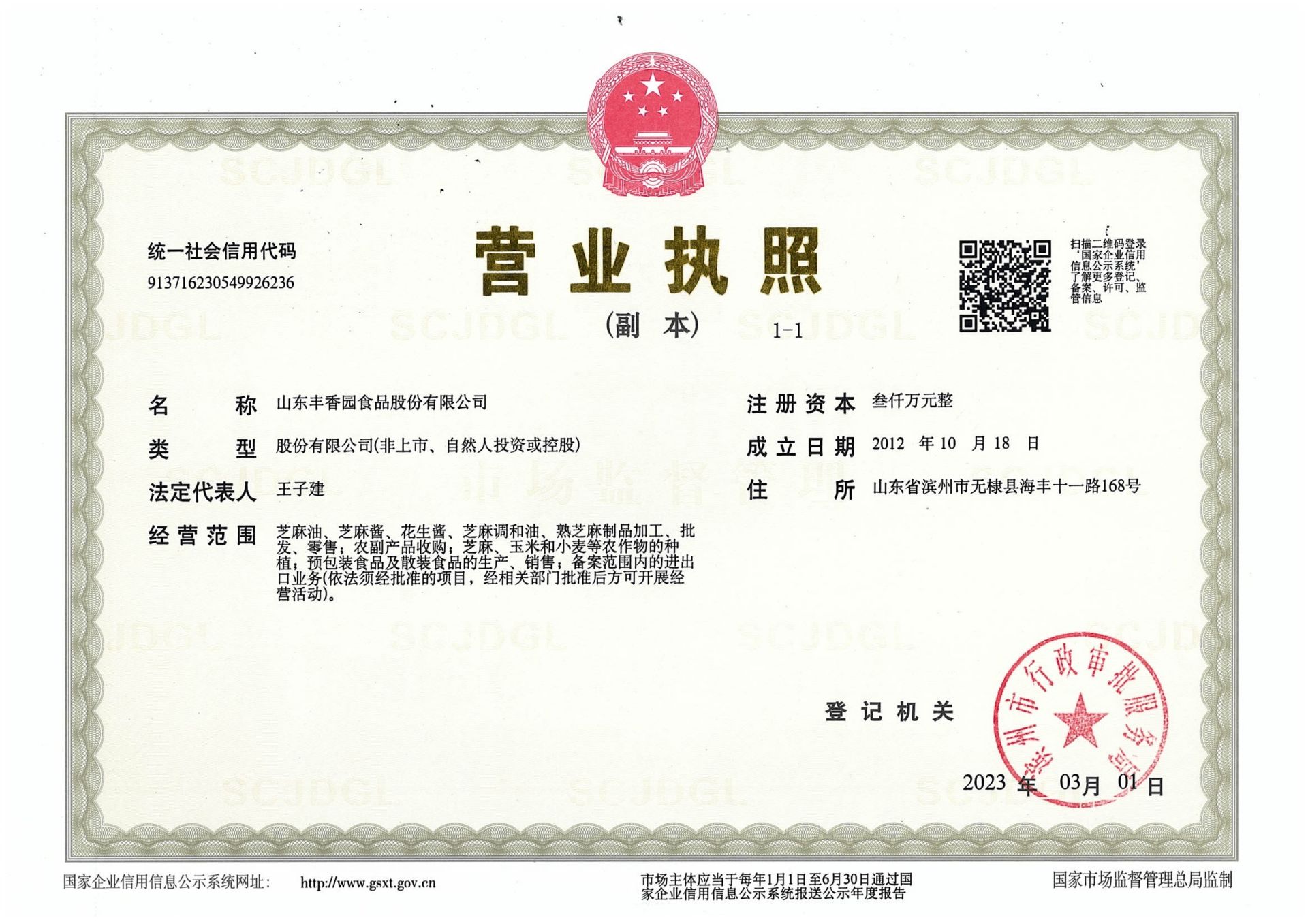 山東豐香園食品股份有限公司位于無棣縣西城工業(yè)園,成立于2012年,注冊資本3000萬元,員工60多人,年銷售收入8000多萬元,是“國家高新技術(shù)企業(yè)”、“中國好糧油”示范企業(yè)、“食安山東”示范生產(chǎn)加工企業(yè),公司集綠色、有機芝麻食品標(biāo)準(zhǔn)化、生產(chǎn)加工、研發(fā)、出口銷售為一體的山東省農(nóng)業(yè)產(chǎn)業(yè)化“重點龍頭企業(yè)”。        公司獲得HACCP國際質(zhì)量體系認(rèn)證、ISO9001:2015質(zhì)量管理體系認(rèn)證,產(chǎn)品獲得美國FDA認(rèn)證、美國、歐盟有機食品認(rèn)證、英國BRC體系認(rèn)證、A級綠色食品認(rèn)證、GB國標(biāo)有機食品認(rèn)證。        公司主要產(chǎn)品有芝麻油、芝麻醬、花生醬、芝麻粉和烘焙芝麻、兒童芝麻食品系列等六大種類上百個品種,產(chǎn)品出口美國、日本、韓國、新加坡、俄羅斯、澳大利亞、美國、等30多個國家。2018-2019年連續(xù)兩年芝麻食品出口量排名山東省第三位、濱州市第一位。        山東豐香園食品股份有限公司是國家級高新技術(shù)企業(yè),建有省級“一企一技術(shù)”研發(fā)中心、市級企業(yè)技術(shù)中心和市級工程實驗室、市級工程技術(shù)中心等多個創(chuàng)新平臺,擁有發(fā)明專利2項,實用新型專利21項,先后獲得省級“專精特新”中小企業(yè)、市級農(nóng)業(yè)產(chǎn)業(yè)化聯(lián)合體、科技型中小企業(yè)、濱州市級瞪羚企業(yè)、市級“一企一技術(shù)”創(chuàng)新企業(yè)和濱州市新興產(chǎn)業(yè)“白名單”企業(yè)等榮譽稱號。